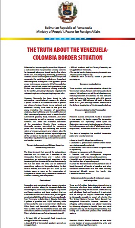 Entre otras cosas, el texto señala que “Venezuela ha visto obligada a tomar medidas extraordinarias constitucionales mediante el cierre de parte de su frontera con el fin de proteger a sus ciudadanos y ciudadanas. Las graves amenazas para nuestra seguridad nacional y económica han aumentado en los últimos años, incluyendo la incursión de la violencia paramilitar, el narcotráfico y la proliferación de prácticas comerciales ilícitas como el contrabando de gasolina subsidiada, alimentos, medicinas y otros productos básicos, así como también a través de esquemas de manipulación de divisas que afectan las condiciones económicas de la población”.