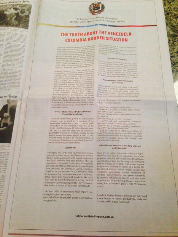 Después de asegurar que la cobertura hecha el pasado 27 de agosto por The New York Times sobre la situación en la frontera con Colombia tergiversaba los hechos y suponía intencionalidad para desprestigiar, ahora el Gobierno venezolano recurre a las páginas de ese mismo periódico para publicar una página completa “La verdad sobre la situación de la frontera colombo-venezolana”.
