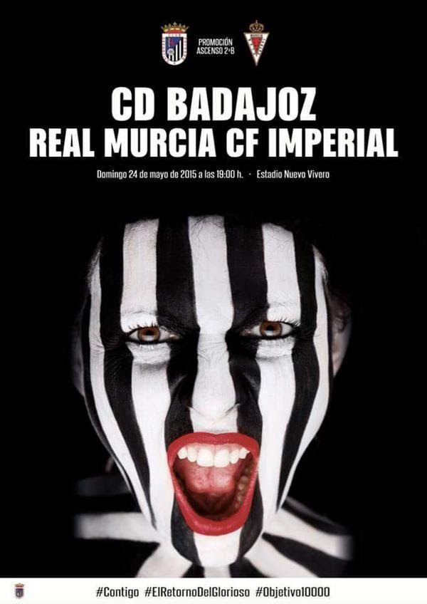 Badajoz protagonizó un partido en el estadio 'Nuevo Vivero' contra el Real Murcia CF Imperial el pasado domingo 24 de mayo y para promocionarlo recurrió a las redes sociales con una campaña de mercadeo muy impactante y emotiva. En la imagen, que apuesta al contraste fuerte, aparece el rostro de una mujer completamente pintado con franjas verticales blancas y negras, en alusión al uniforme del equipo. Sus ojos y la boca, resaltada con pintura labial, son los únicos elementos que destacan en la cara de la modelo, que muestra un gesto agresivo, de grito, de exaltación.