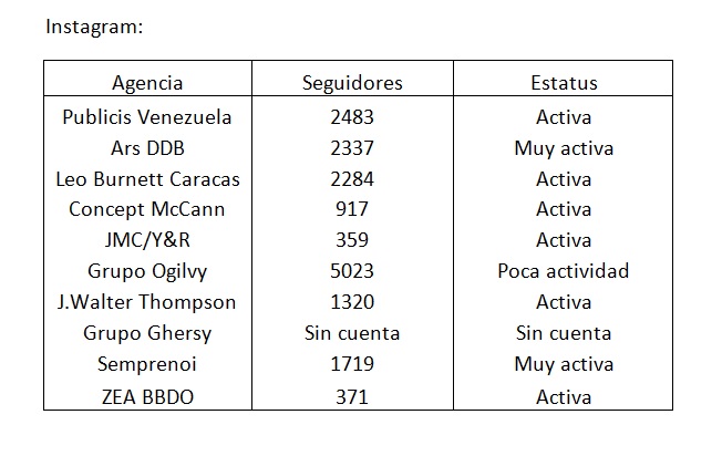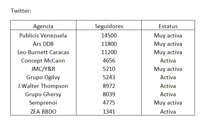 Todo apunta a concluir que las agencias prefieren realizar sus comunicaciones por otras vías, como las redes sociales, donde la realidad sí es muy distinta. Estos medios se evaluaron por el número de seguidores (al 22 de julio) y la frecuencia de publicación. En Twitter, todas las agencias son muy activas, suelen publicar sus trabajos y contenidos de interés para sus seguidores. Facebook es más variopinto, unos lo aprovechan mejor que otros. Instagram, en general, es utilizado para mostrar lo que sucede dentro de las agencias, algún evento especial, etc. Pero además estos canales son usados para captar talentos para la organización. En las siguientes tablas podrán ver el movimiento de las agencias en estas redes: