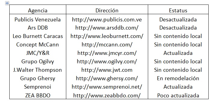 PRODUCTO examinó qué canales utilizan las agencias en estos momentos de crisis para comunicarse con su entorno. Se realizó un recorrido por las páginas web de las 10 primeras agencias del país,  esperando encontrar una muestra de sus últimos trabajos; pero el hallazgo fue deprimente: portales con contenidos desactualizados y en otros casos solo está la página de la agencia internacional que los representa o de la cual son socios, en la que tampoco se halla contenido local.