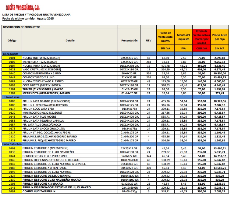 Así, por ejemplo, se informa que el Pirulin estuche de lujo de 120 gramos tiene un precio de venta justo más Impuesto al Valor Agregado de 200 bolívares. “Calidad y valor en su justa medida”, acota la empresa.