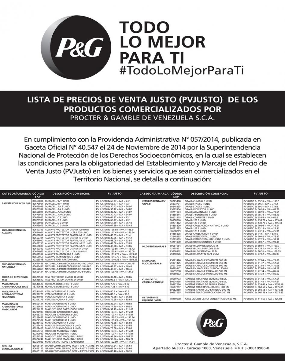 "El compromiso de P&G Venezuela durante sus 65 años de historia en el país siempre ha sido ofrecer los mejores productos para el consumidor venezolano, abasteciendo el mercado de manera estable, oportuna y en estricto apego a la normativa de ley vigente". Así comienza el comunicado de prensa emitido por la empresa ante los fuertes señalamientos hechos en su contra por parte de voceros del oficialismo debido a una lista que la empresa hizo circular con los precios de sus productos.